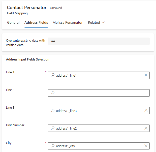 - Open the Personator output field you need and pick a Dataverse mapping using the 'Destination field' value.