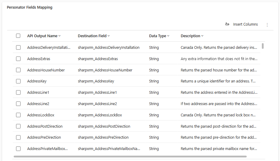 - If the subgrid is empty, you can click on the 'Insert Columns' button to populate it. It will be populated will all columns that can possibly be returned by Personator (column API Output Name).